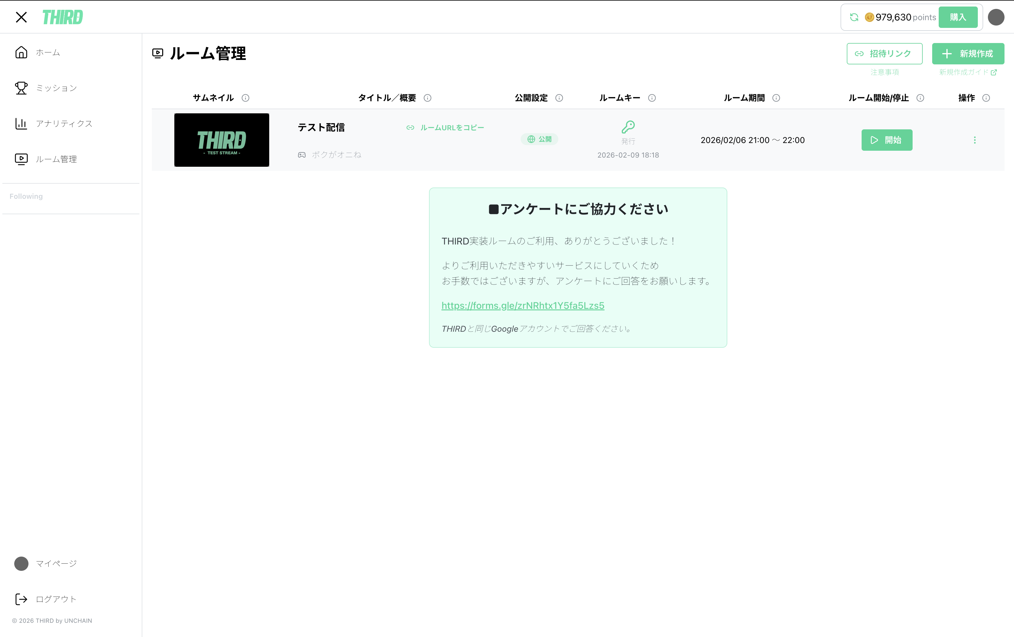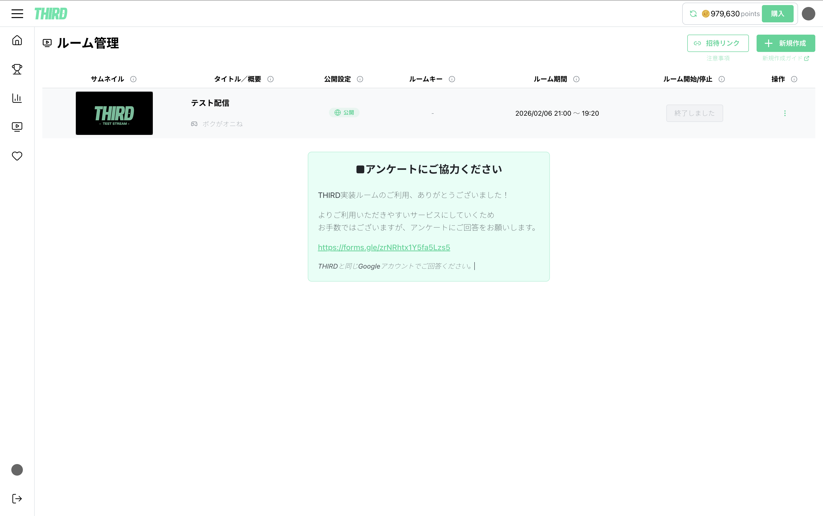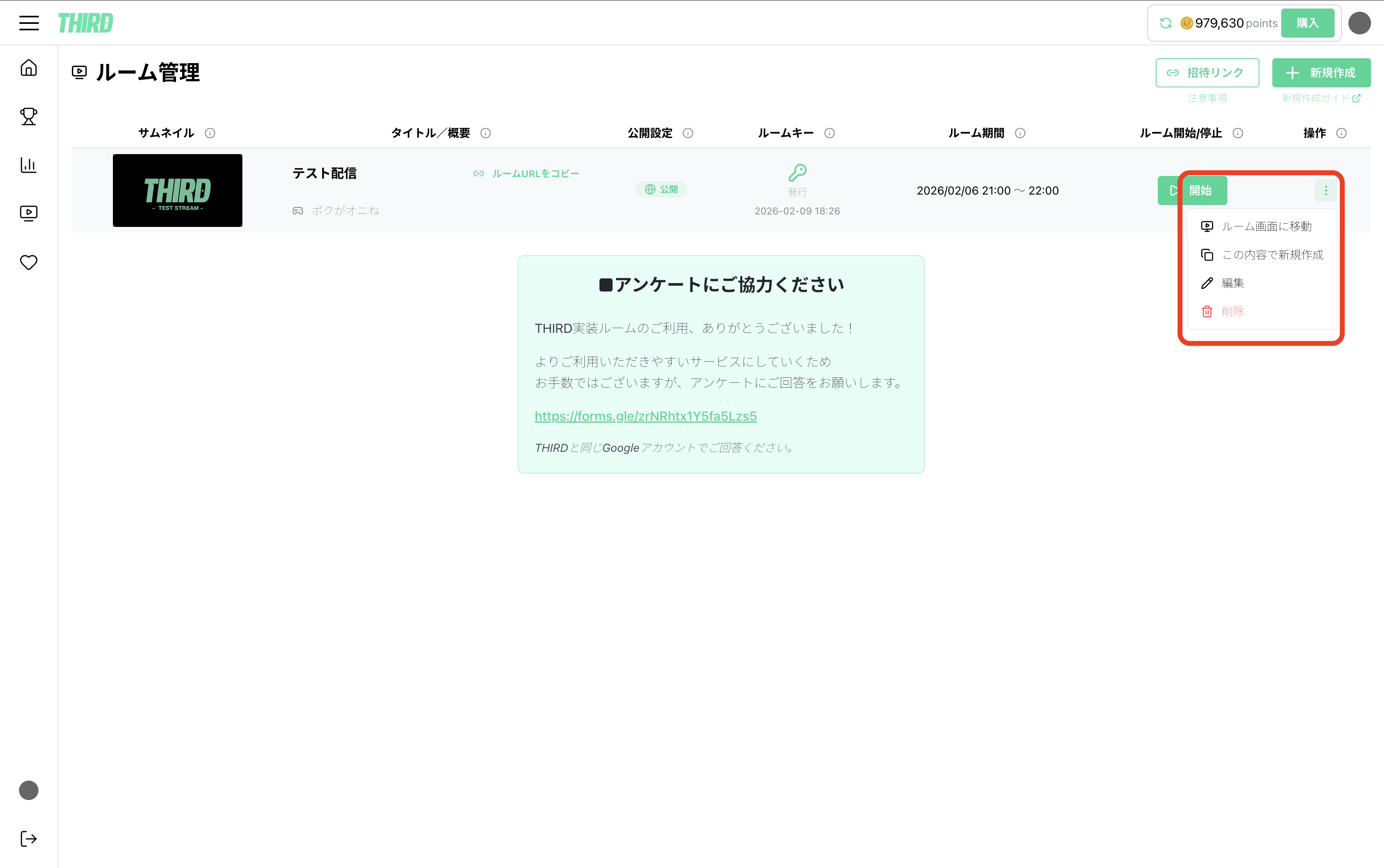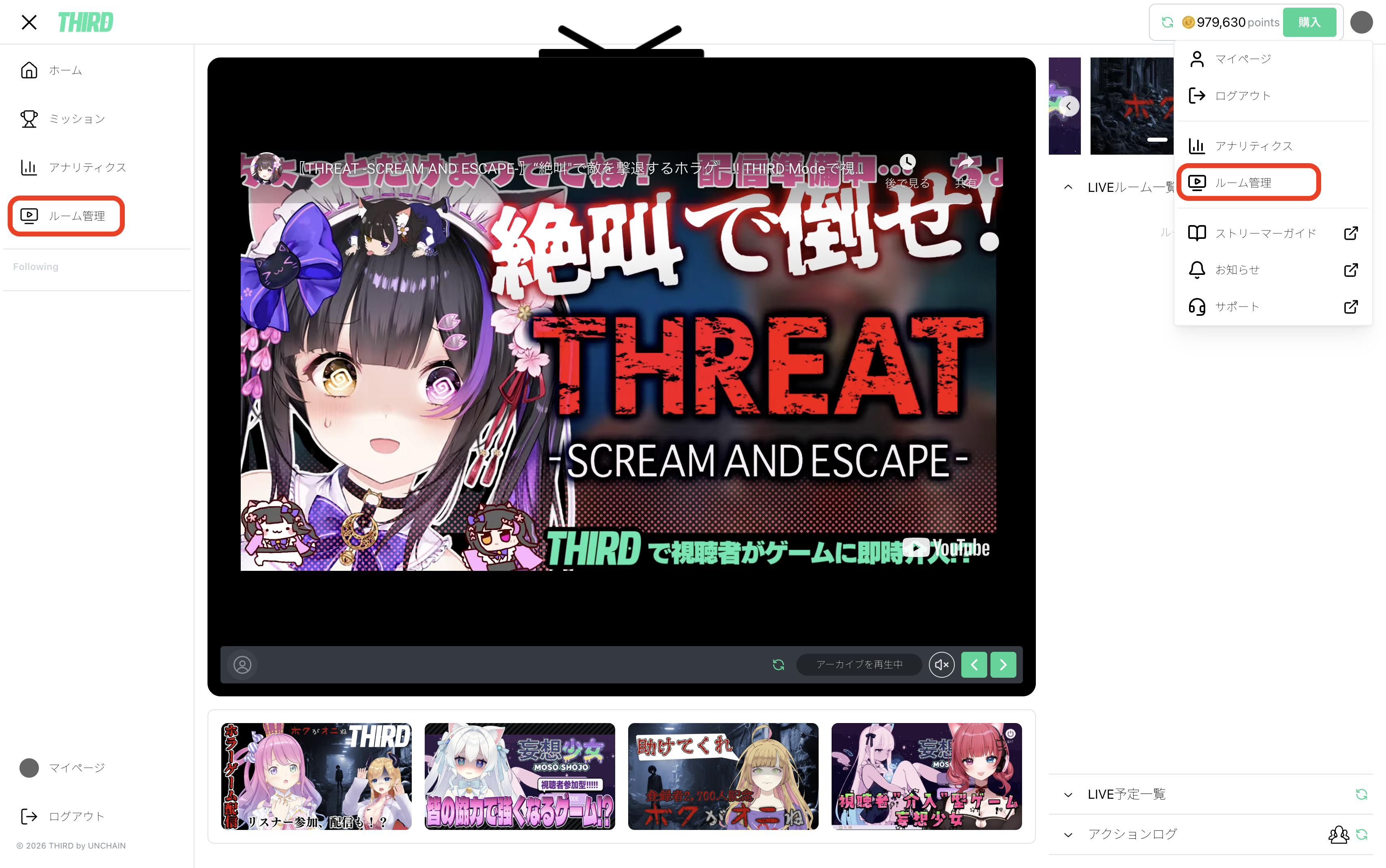 THIRD配信者アカウントでログインした場合、メニューに「ルーム管理」が表示されます。