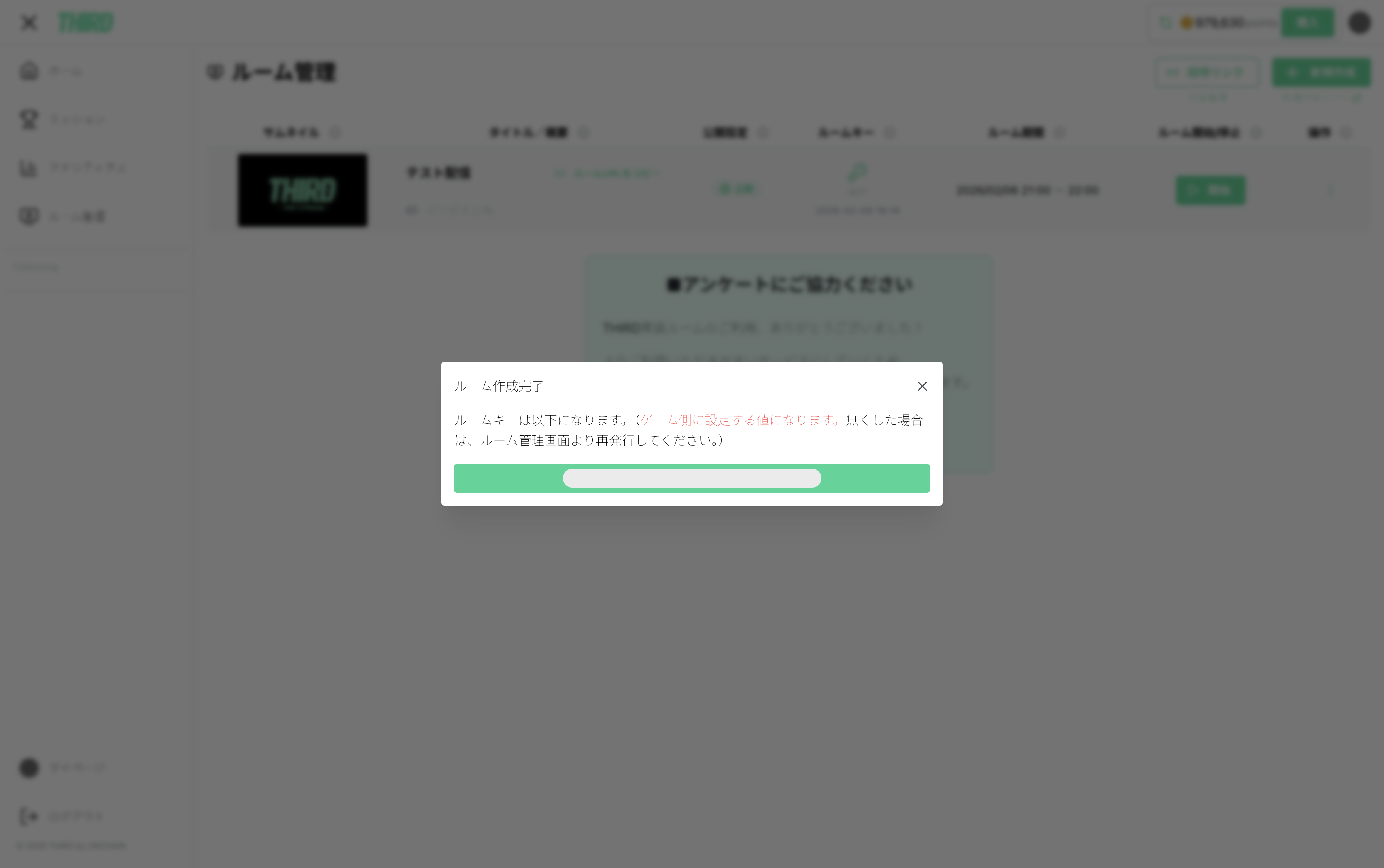 THIRD上でLIVE予定からLIVE中にステータスが変更になります。 - ゲーム内にルームキーを入力(入力画面はゲームタイトル毎に異なります)