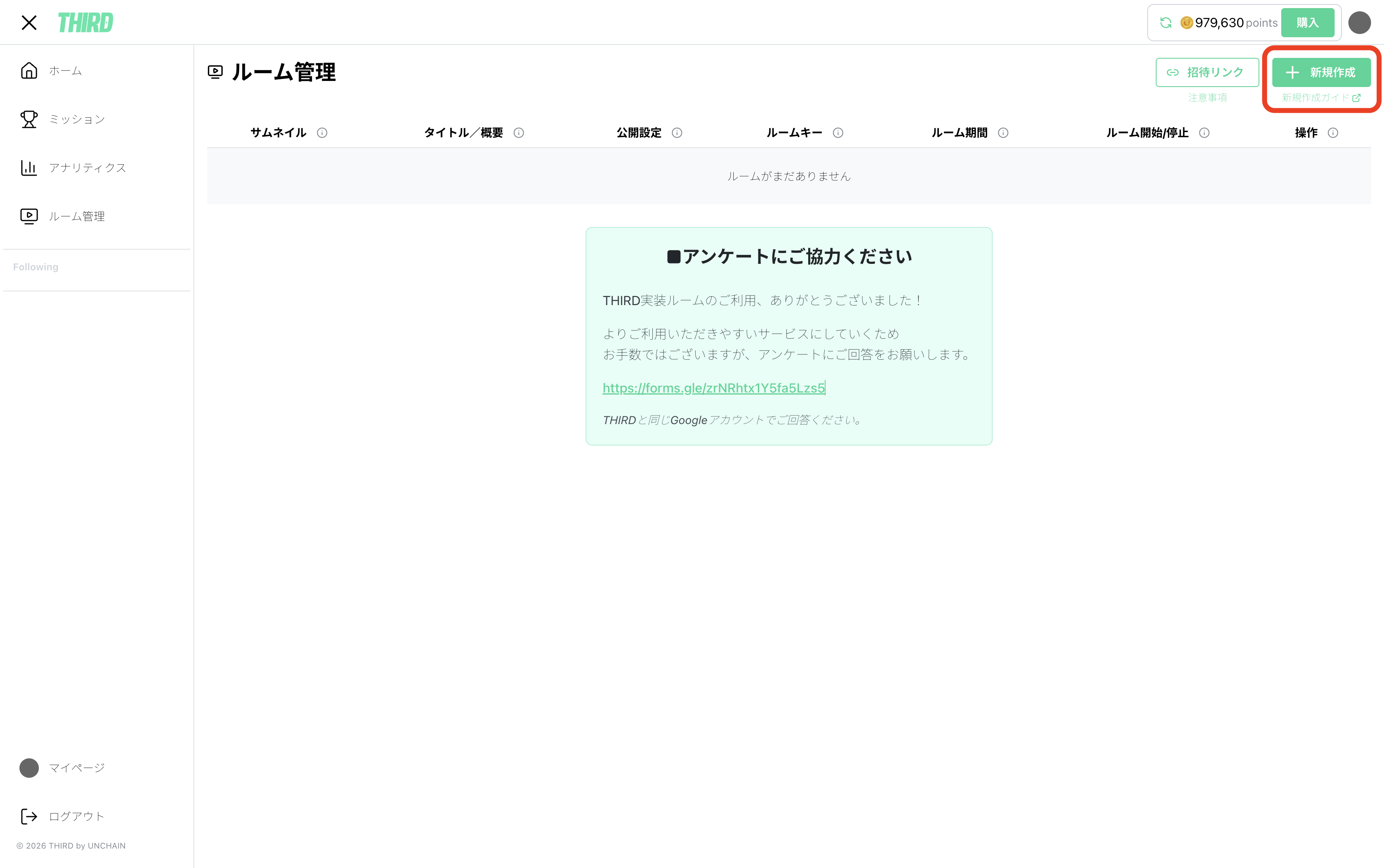 新規登録ボタンからルーム作成を行います。