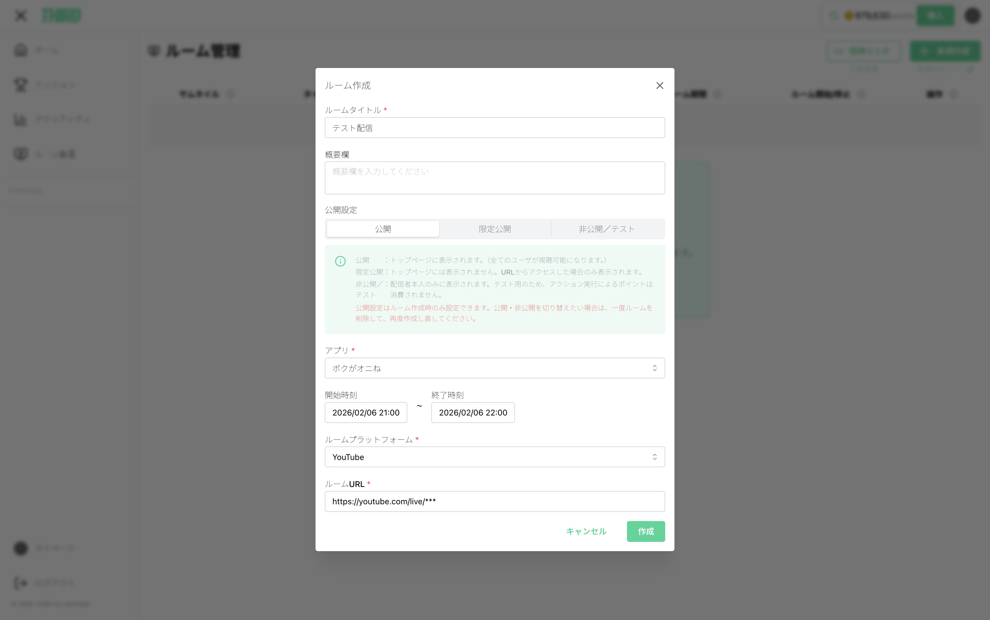 | ルームプラットフォーム | 「Youtube」または「Twitch」を選択 |
