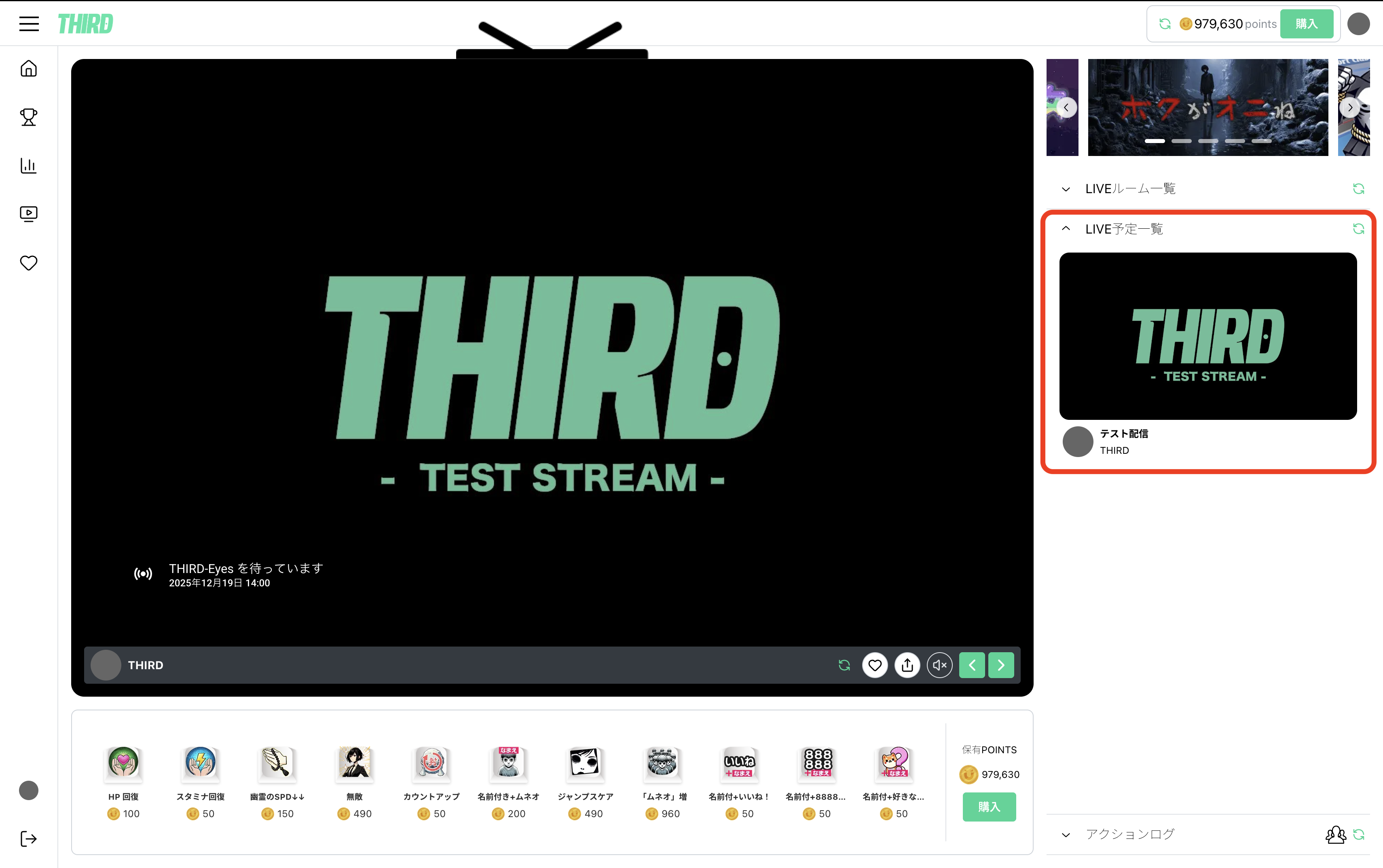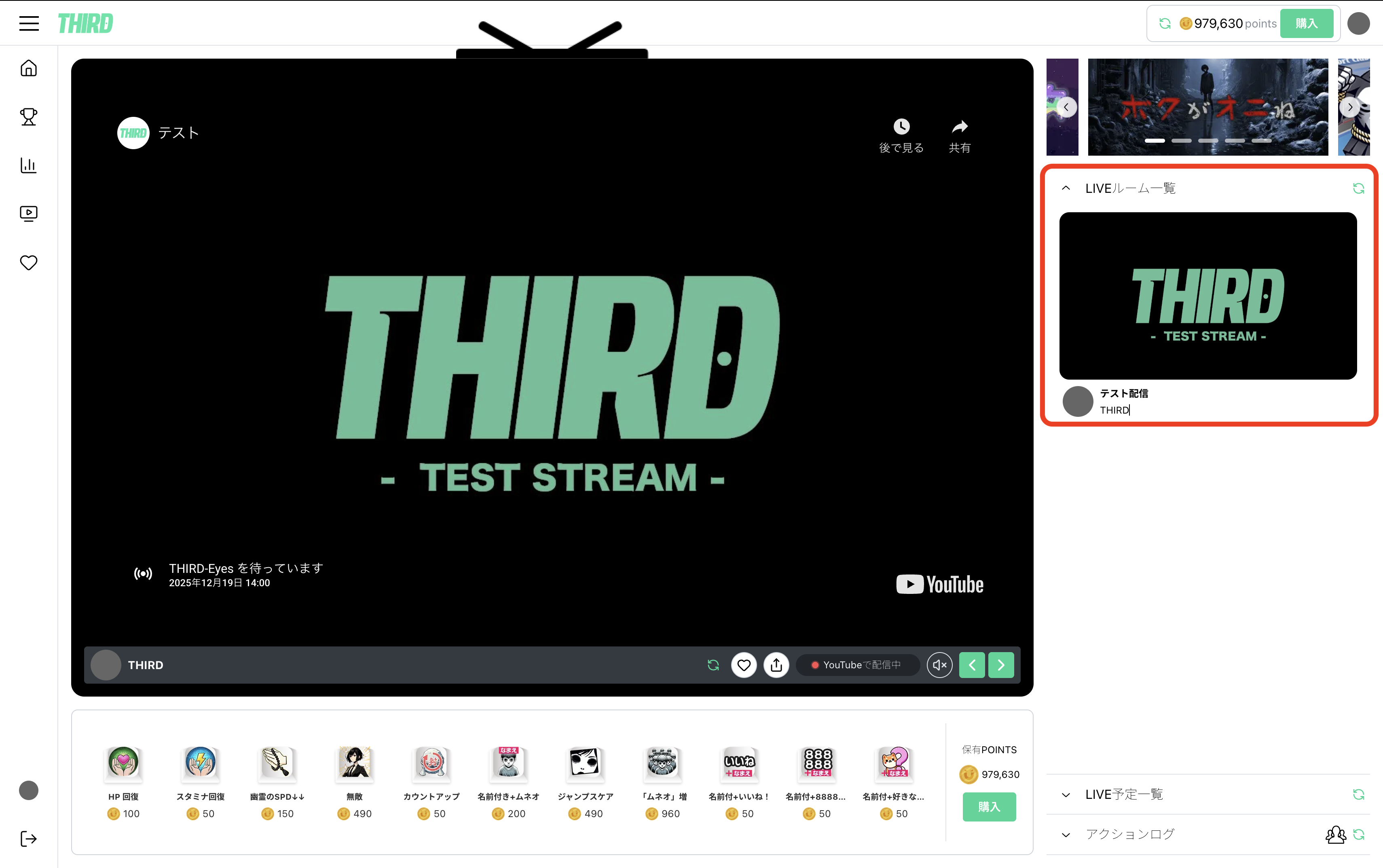 THIRD上でのライブ映像表示はYoutube LIve / Twichでライブ開始したタイミングで表示されます。特別な操作は必要ありません。